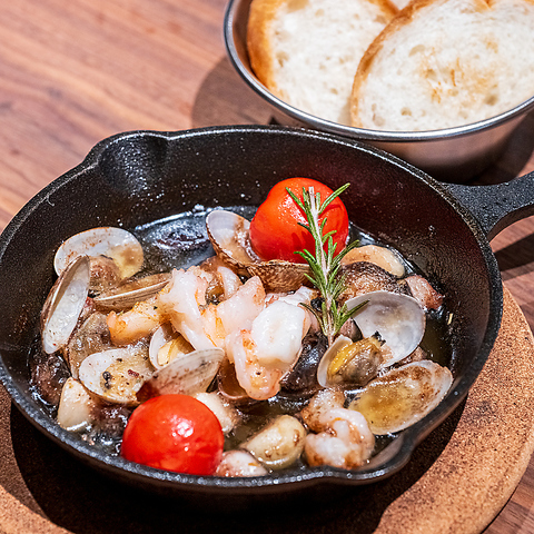 アサリ・エビなどを含むシーフードをふんだんに使用したアヒージョ。バゲット付きです!(バゲットは追加注文も可能です)