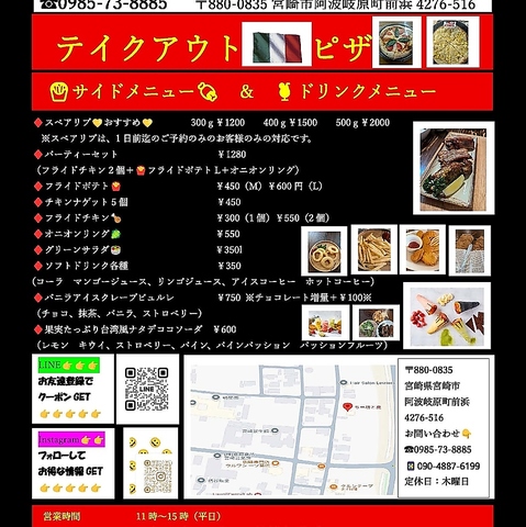 - ピザは全品テイクアウト可能です。(一部期間限定メニュー除く)ドリンクも全品テイクアウト可能です。※テイクアウトにランチセット、半ピザランチはテイクアウト対象外です。※チーズたっぷり溶岩ミートスパゲティ、賞味期限10分の生パスタはテイクアウト対象外です。
