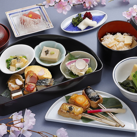 名物のクリームチーズゼリー寄せや、筍と秋田牛の贅沢な出会いが特別な席を彩ります。京の白味噌仕立てや若竹鍋など、春の訪れを五感で愉しむ献立は、お祝いの場を一層華やかに。締めには筍鰆茶漬け、または香り高い土鍋炊き筍御飯が愉しめます。美しい盛り付けと、季節の移ろいを感じる幸せなひとときをお過ごしください。