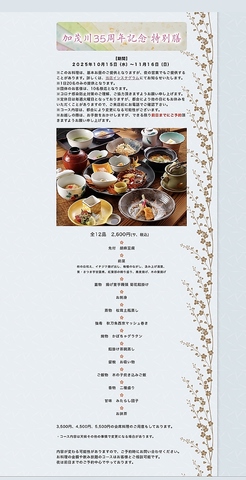 ◆ランチ【2025年10月15日(水)~11月16日(日)限定】加茂川35周年記念 特別膳2600円(サ税込)