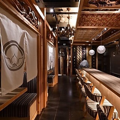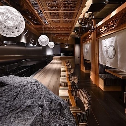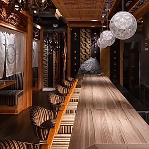 細部までこだわって作られた高級感のある店内。壁紙には着物の生地を使用し、木の細工はすべて手彫りの、細部まで高級感が感じられるモダン空間が広がります。お席はデートやカジュアルなお食事に使いやすいカウンター席や、接待などのビジネスシーンにも使いやすい半個室・完全個室をご用意。シーンに合わせて幅広くご利用いただけます。