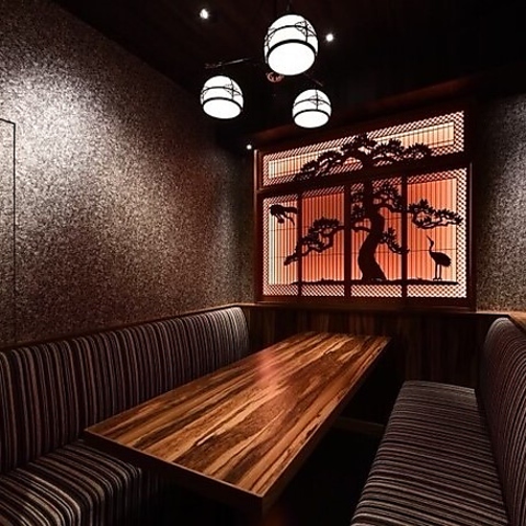 【プライベート完全個室を完備】接待などのビジネスシーンに最適な完全個室を完備しています。ゆったりと寛げるシックでモダンな和個室は、高級感あふれるお洒落な雰囲気が魅力!周りを気にせずプライベートな空間で、大切な方との会食や、ビジネスでの重要な会話も心ゆくまでお過ごしいただけます。
