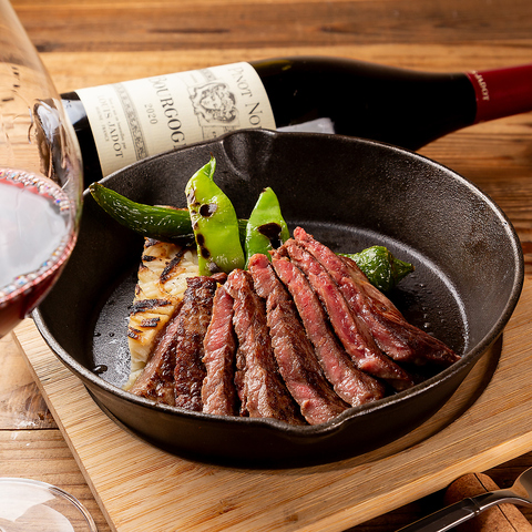 目の前でとろとろのラクレットチーズかけられるサーロインステーキは圧巻そのもの。背徳感で満たされる一口はついついワイングラスに手を伸ばしたくなります!好みのワインとペアリングで楽しんで贅沢なご褒美時間を♪