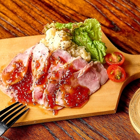 当店大人気の一品でもある自家製ローストポーク低温料理でじっきり焼き仕上げてます。特製ステーキソース、ワサビにつけて召し上がってください。