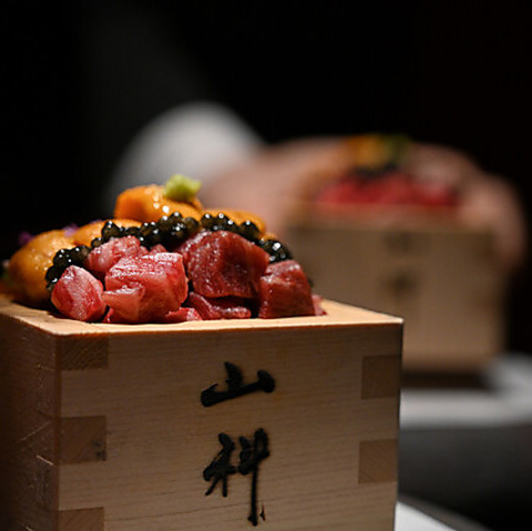 黒毛和牛のみならず、旬の新鮮な海鮮を組み合わせた華やかなお料理もご用意しております。目でも楽しめる黒毛和牛と海鮮の宝箱寿司など、四季折々の食材を贅沢に盛り込んだ料理がテーブルを彩ります。伝統的な技法を守りつつ、現代的な感性を取り入れた一皿は、好評をいただいております。特別なランチやディナーに、是非ご賞味ください★