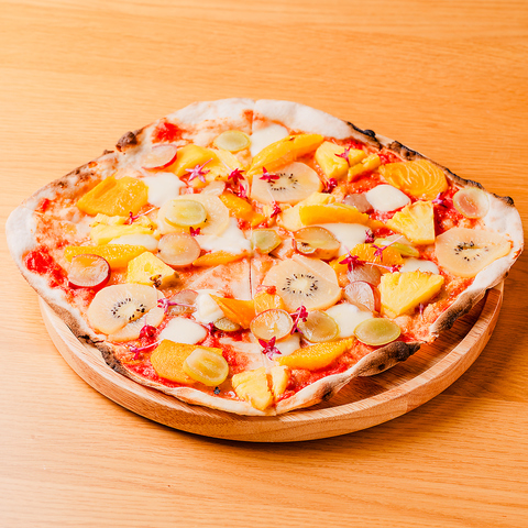 新鮮な季節のフルーツを5~6種類使用したフルーツピザです。300度の高温の釜で1分半ほどさっと焼くことで、フルーツの甘みが増してよりジューシーになります。SNS映えもばっちりなので、デートや女子会にオススメです!みんなでシェアして楽しめること間違いなしです!