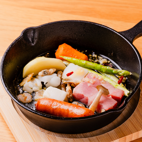 北海道産無菌豚のベーコン、男爵いも、にんじん、ブロッコリー、ソーセージ、きのこ2~3種類とたくさんの野菜にミルクの風味が滑らかな花畑牧場のラクレットチーズをたっぷりかけたグリルがオススメです★当店人気のお料理です!ぜひアツアツをお召し上がりください!