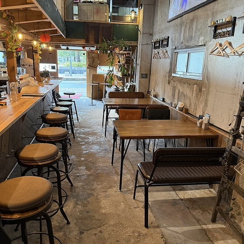 テーブル席も雰囲気◎コンクリートと木材の美しいコントラストが魅力的。温かみのある照明が心地よさを演出します。ソファーは座り心地◎アットホームな雰囲気で、親しい友人との集まりにもぴったり。ぜひ、お気軽にお立ち寄りください。ご来店、お待ちしております。