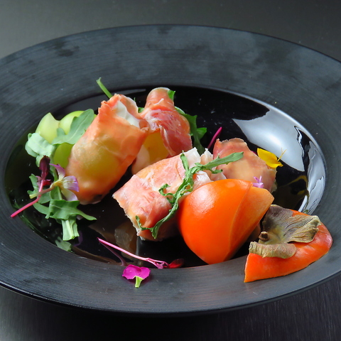「季節のフルーツとマスカルポーネチーズ・生ハムのインボルティーニ」も、ぜひ味わって欲しい自慢の逸品!山形県産の旬のフルーツとマスカルポーネチーズを生ハムで巻き込み、蜂蜜とエキストラヴァージンオリーブオイルをかけて仕上げました。甘みと塩気が絶妙に調和した味わいは、一度食べたら病みつき。