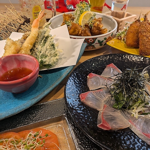 全100種類以上で長浜市場直送の刺身・寿司・天ぷらが食べ飲み放題です。