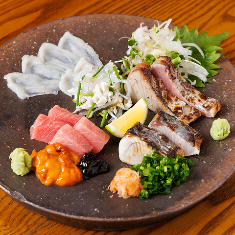 鮮やかな色合いが目を惹くお刺身の盛り合わせ。季節に応じた選りすぐりの海鮮をご用意!五種類の味わいを楽しむことができます。好きなものを単品で味わうのも良し、盛り合わせで贅沢に堪能するのも良し。特製の海苔醤油で新たな風味を楽しむことができます!