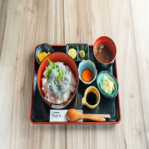 岸和田港から直送された新鮮な生しらすをたっぷりと盛り付けた「生しらす丼」。とろけるような食感とほんのり広がる海の風味が絶品。薬味や卵黄と絡めれば、旨みがさらに引き立ちます。鮮度抜群の味わいをぜひ。