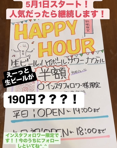 生ビール380円が300円!?平日19時まで、土日祝18時までドリンクがお得になるハッピーアワー実施中!