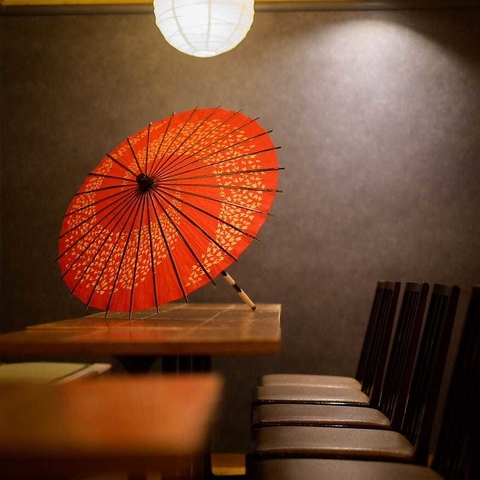 和傘が特徴のお洒落な店内。様々な人数に対応可能なテーブル席では、少人数の集まりから、テーブルを繋げて最大28名様までのお席もご用意可能です。ご友人との飲み会や女子会、会社の同僚との宴会などにもぜひご利用ください!