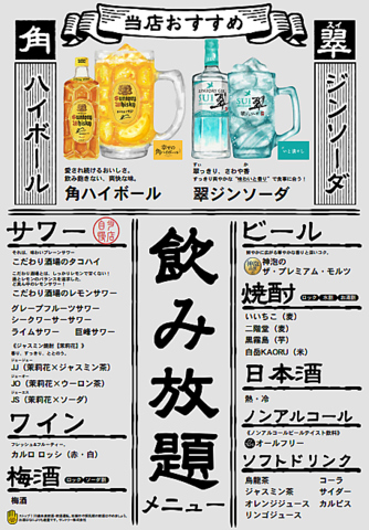 2時間飲み放題/+1500円(税込)でプレミアム飲み放題に変更可能です。