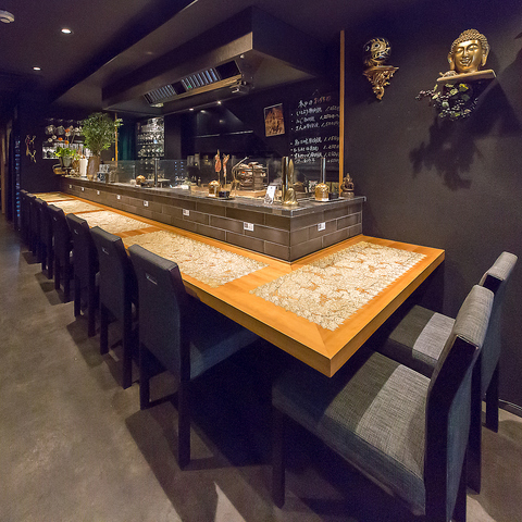 落ち着いた雰囲気の中で食事を楽しむのにぴったりなカウンター席。シンプルな木のテーブルと黒を基調としたインテリアが調和し、目の前で料理を楽しみながら、心地よい時間を過ごせます。