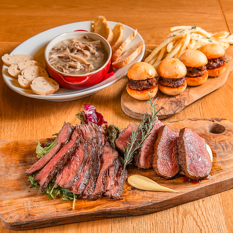 料理は全部で6品(前菜盛り合わせ、キャベツのアンチョビバター、フレンチフライ、モツ煮込み バケット付、お肉の盛り合わせ、パスタ)をご用意しました!女子会やデート・おしゃれな宴会にしたい方におすすめ♪飲み放題は+1980円(税込)で追加可能です◎