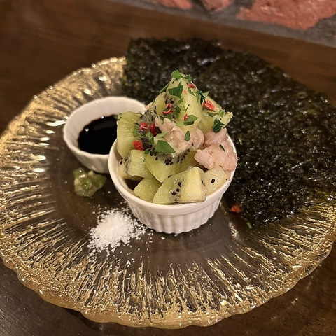 珍しい組み合わせですが、ネギトロはモチロン、キウイの酸味と醤油の相性も抜群◎刻み山葵と韓国海苔で巻いて頬張る新しいキウイ料理♪味覚と視覚の両方で楽しめる、お酒との相性も抜群の一皿です♪ぜひ一度ご賞味ください!