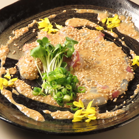 「胡麻に抱かれし魚」は素材の良さを活かた特製のゴマダレソースは一度食べたらやみにきになる!食材の個性を引き出した一皿一皿がお客様の舌を愉しませます。どのお料理もお酒との相性が抜群に良く、当店ならではの深い味わいと洗練された至福のひとときを心ゆくまでご堪能下さい。
