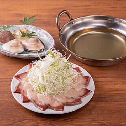 当店の看板メニュー【ぶりしゃぶ】の季節が到来しました!刺身でも楽しめる新鮮な鰤をアラ出汁のスープでさっと火を通し、ネギを巻いてポン酢または胡麻ダレでどうぞ♪さらに、お一人様には蛤が2つ付いており、スープに入れて旨味を引き出します。貝が開いたら軽く火を通し、ぷりぷりの蛤を胡麻ダレで楽しんでください。