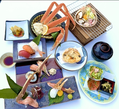 「かに寿司盛」「かにのお造り」「甲羅焼」「かに半身盛」「グラタン」など、繊細な蟹の風味を引き立てる多彩な料理が揃い、和~洋を五感で味わう贅沢なひとときをお過ごしいただけます。