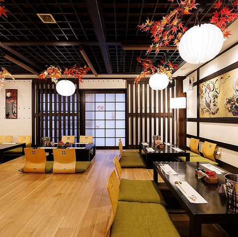 【プライベート空間でごゆっくりお過ごしいただける個室も完備!】落ち着いた色調とシンプルなデザインが特徴の個室は、プライベートな空間でお食事や会話をお愉しみいただけます。和の装飾品がアクセントとなり、温かみのある雰囲気を演出。ご家族のお集まりや会社のご宴会、接待など様々なシーンでご利用いただけます。