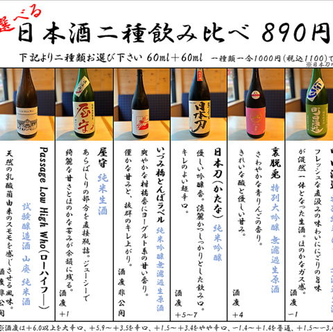 全国から厳選した日本酒12種の中から、お好きな2種を選んで飲み比べできる贅沢なセット。60ml×2で890円(税込979円)と気軽に楽しめ、個性豊かな味わいをじっくり堪能できます。日本酒初心者にもおすすめのラインナップです。季節限定の銘柄やレアな一本も楽しめる飲み比べセット。同じ純米でも風味の違いはさまざま。今日はどれを選びますか?
