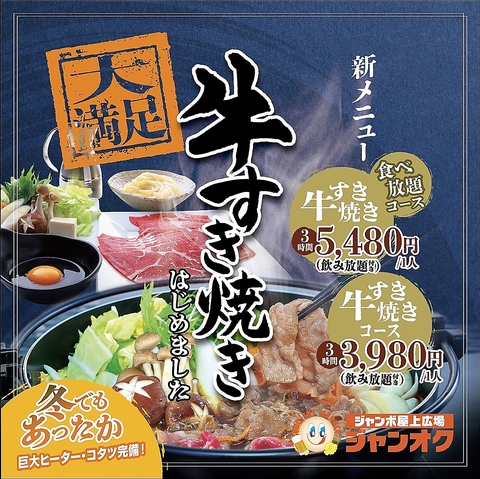 みんな大好き!【大満足 牛すき焼きコース】はじめました!お得な牛肉食べ放題コースもご用意してます!