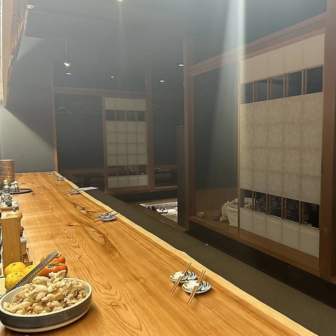 大きな木製カウンターは自然の温もりを感じさせ、料理と会話を楽しむのにぴったりです。目の前で調理が繰り広げられる臨場感を味わいながら、料理に込められた思いを感じることができます。また、少人数向けの設計は大人の会話を楽しむことができ、食事をより魅力的に演出します。心を込めた料理と豊富なドリンクをごゆっくりご堪能ください。