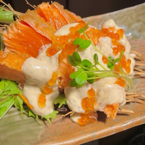 厳選サーモンにお客様の目の前で直接炭でたたく逸品。見た目でも楽しめるライブ感満載の贅沢な一品。