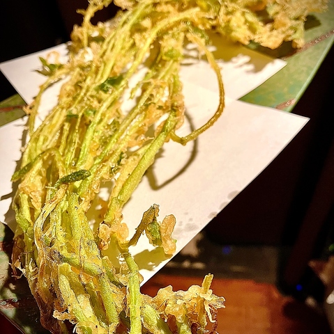 仙台せりを一本丸々天ぷらにした豪快料理。旬の味わいは勿論の事見た目のインパクト抜群◎