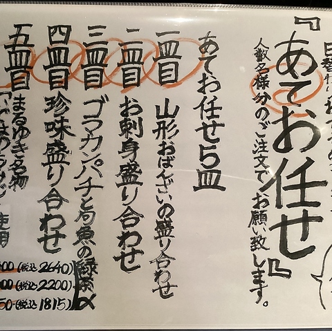 日替わりオススメ「あてお任せ」山形のおばんざい盛りを始め新鮮刺身盛りだし巻き卵等1650円からご用意