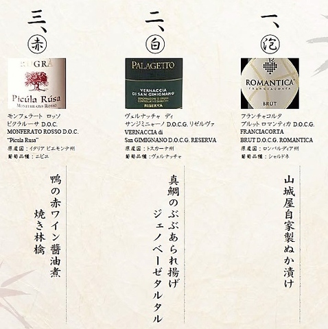 当店のソムリエが選ぶおすすめ3種のワインと、それに合わせたおつまみとして山城屋庄藏月替わりの一品3種が気軽に味わえる「ワインペアリング」をテーブルチャージ込み2,990円のお得なプライスで提供しています。ワインのチョイスに迷ってしまう方も、毎月変わるソムリエおすすめのワインを楽しみたい方にもおすすめです。