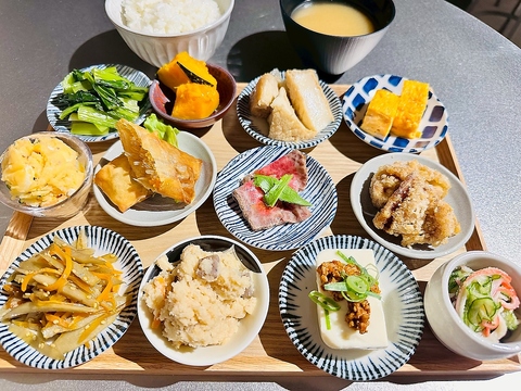 当店では、旬の素材を活かした心あたたまる「おばんざい」や日替わりのご飯を朝9時からお楽しみいただくことができます♪ご飯ものから煮もの、焼きもの、揚げものに夜はお酒のアテにピッタリの料理まで多彩に取り揃えており、季節に合わせたメニューで皆様のテーブルを華やかに演出◎