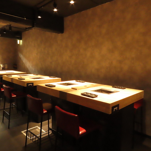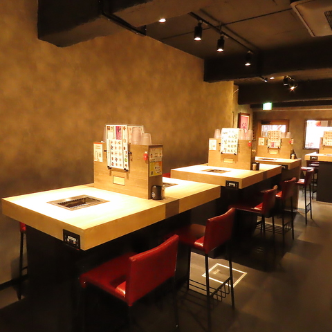 店内はシックで落ち着きのある店内となっております。排煙フードを設置しておりませんので、上部が広々としており窮屈さがありません。おひとり様でもカジュアルに焼肉をお楽しみいただけるような雰囲気になっております♪ぜひお越しください。