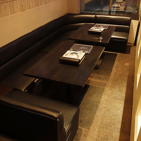 落ち着いた雰囲気の半個室ソファー席で、ゆったりとした時間を過ごせます。プライベート感があり、友人や大切な人とゆっくり過ごすのにぴったりです。黒のレザーソファーとシックなテーブルが、洗練された空間を演出。心地よいひとときをお楽しみいただけます。