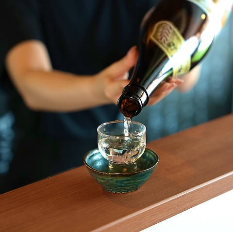 日本酒のグラスは実際に一升瓶をお客様の前までお持ちいたします。目の前でなみなみまでたっぷり注がせていただきます。