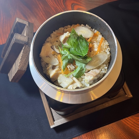 お客様のお席で炊き上げる釜めし、しめ鯖の炙りサービスもございます。