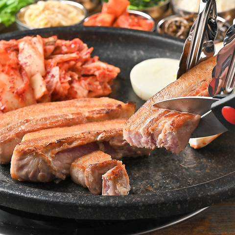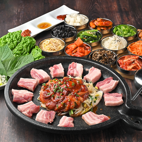 厚切りの国産生サムギョプサルをメインに、トッポギやチヂミ、ヤンニョムチキンなど人気の韓国料理をオーダー式で楽しめる贅沢食べ放題!さらに、キムチやナムル、サラダ、韓国ラーメンなど充実のサイドメニューがバイキングスタイルで取り放題。韓国海苔やにんにく・唐辛子も揃い、本場の食べ方も満喫!
