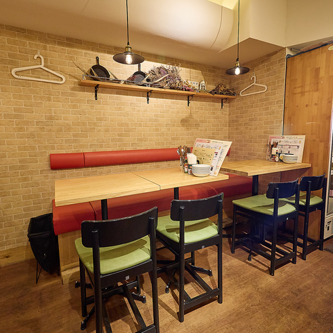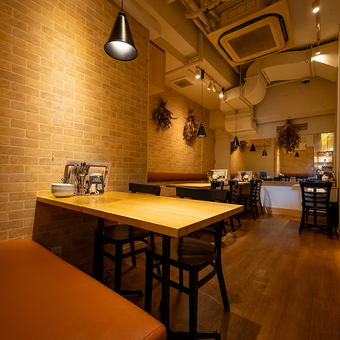 木目調・レンガ調の内装で暖色系にまとめた店内。温かみがあり、カジュアルながらゆったり寛げる空間です◎