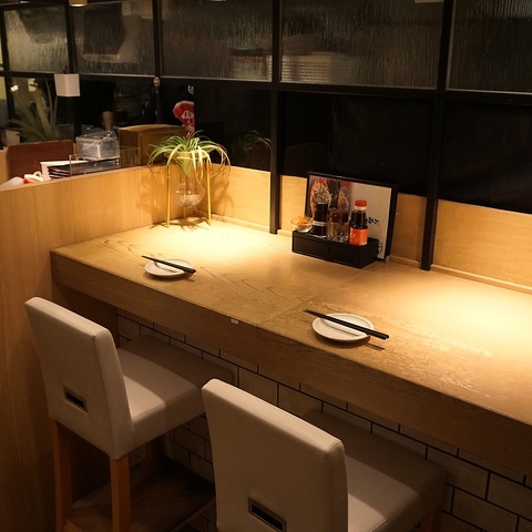 店内は落ち着いた雰囲気のプライベート空間が広がります。周りを気にせずゆったり楽しめる個室はもちろん、ペアのお客様やお一人様も気軽に楽しめるカウンター席も多数ご用意しております。