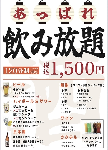 飲み放題付の宴会コースも2パターンご用意しております!2時間単品飲み放題も1500円でご利用いただけます!