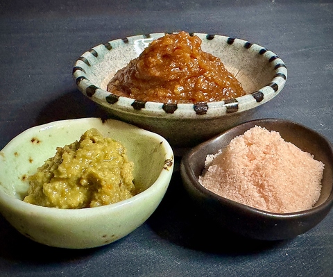 アグー豚本来の味を味わうために、沖縄県産素材の薬味をご用意・屋我地島の塩・石垣島シークヮーサーこしょう・玉那覇味噌(オリジナルブレンド)