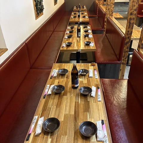 距離感も近しいながれもゆったりとした感覚が、長居しながらも落ち着いた時間を提供するテーブル席になります。宴会コースをご注文頂き、長時間座っていても、移動しやすく、話しやすい席配置にしております。幹事様もオープンな席配置なので、全体を見渡しやすく、出席者やゲストの顔を伺うことに容易です。