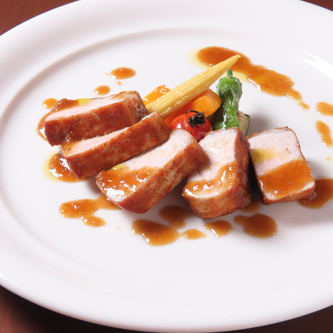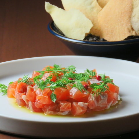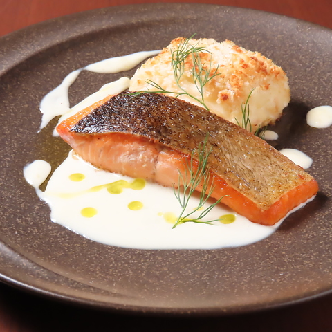 信州サーモンをじっくりソテーし、魚介の旨味を引き出したシェフ特製の白ワインソースで仕上げています。