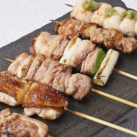 秋田比内地鶏を丸ごと一羽から捌いているため、他では味わえない希少部位がお楽しみいただけます。毎日、その日に使う分の焼きとりを、職人が1本1本丁寧に串打ち。こだわりのこだわりの備長炭で職人が丁寧に焼き上げるため、旨味もしっかり閉じ込めます。