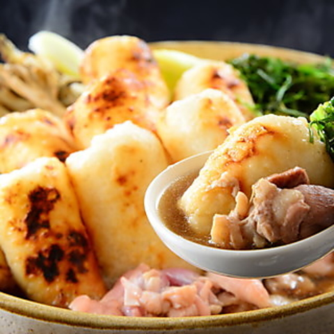 きりたんぽ鍋は比内地鶏生産責任者から毎日届けられる新鮮で良質な丸鶏を使用。山鳥に似た風味と香味、噛む程に口の中に広がる旨味とコクが特徴で、こだわりのスープで仕上げております。比内地鶏と野菜の旨味をたっぷりと吸ったきりたんぽは格別で、秋田の豊かな郷土を感じることが出来ます。