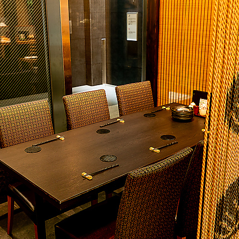 【半個室席】接待や会社宴会に最適な、プライベート感の高い半個室をご用意しております。4名様から最大14名様まで、周りを気にせずゆったりとお過ごしいただけます。上質な空間で、新鮮な比内地鶏焼鳥と逸品の数々を心ゆくまでお楽しみください。各種ビジネスシーンや、特別な宴会にぜひご利用ください。