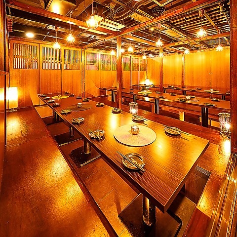 【個室完備】店内に入ると隠れ家のような寛ぎの空間が広がります。個室席は2名様から団体様まで幅広く対応!最大150名様までの個室もご用意可能です。お仕事帰りの飲み会、接待や二次会、各種ご宴会をお楽しみください。飲み放題付コースは多様な価格帯でご用意しております◎ただいま飲み会・宴会のご予約受付中!