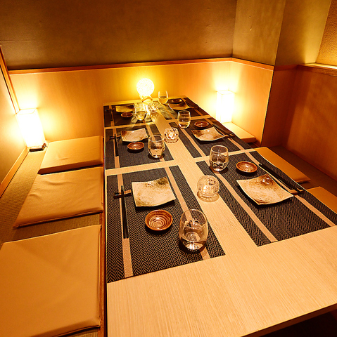 【半個室】広々ゆったりした席で美味しいお食事を楽しめる。大切な方との会食などにもご利用いただいております。温かみある木の質感と柔らかな照明が心地よい、全席個室の名駅居酒屋。周囲を気にせず会話を楽しめる空間は、デートや女子会、会社の飲み会にもぴったり。